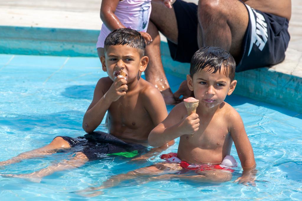 2022年6月22日,在希腊雅典市区一处喷泉内,孩子们坐在水中吃冰淇淋。新华社发(马里奥斯·罗洛斯摄)