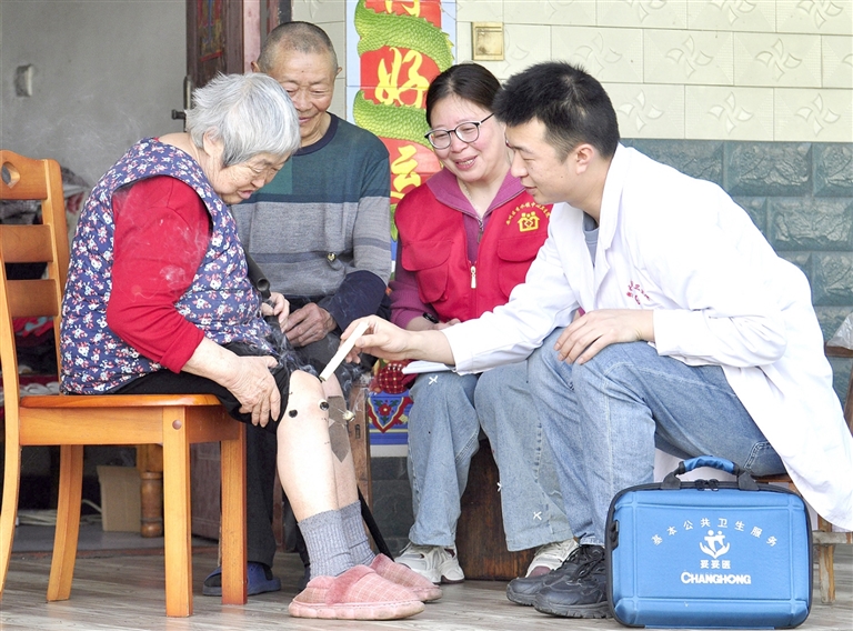 四川省绵阳市安州区秀水镇中心卫生院中医师为老年人进行右膝关节温针灸治疗