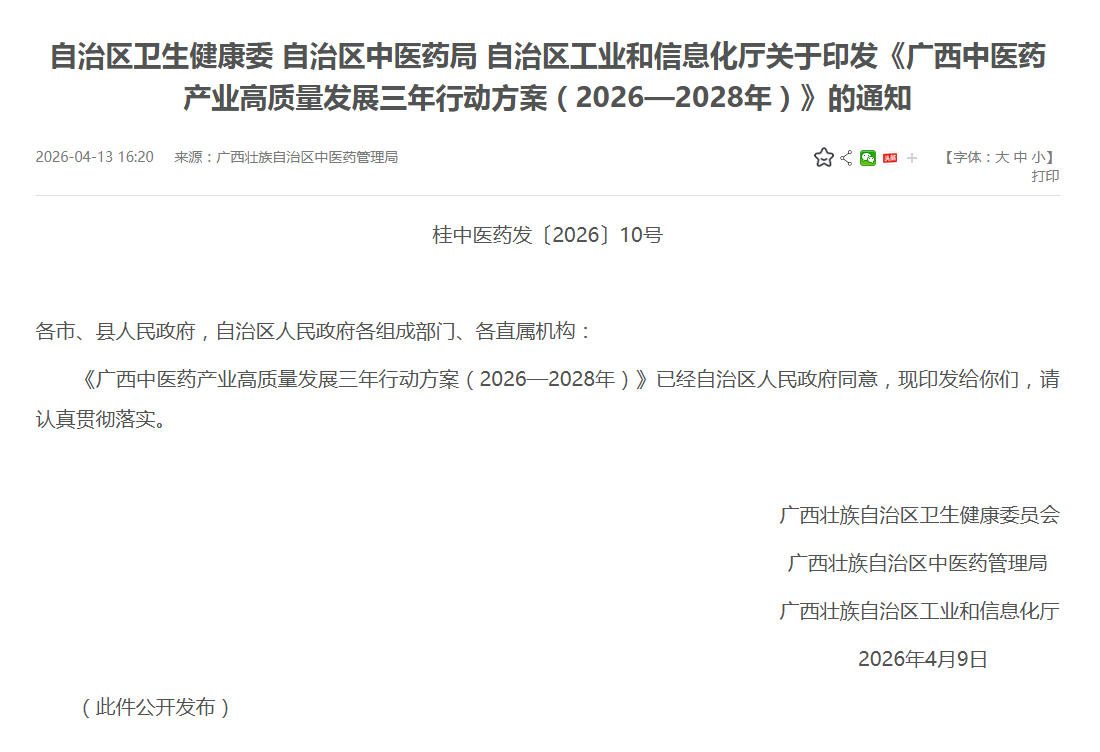 日前,广西壮族自治区卫生健康委、自治区中医药局、自治区工业和信息化厅联合印发《广西中医药产业高质量发展三年行动方案(2026—2028年)》,提出到2028年,中医药产业实现从规模扩张向质量效益提升的转型跨越,在中药资源保护、道地药材种植加工、特色中药研发、产业融合发展等领域形成差异化竞争优势,全产业链总产值突破1100亿元。