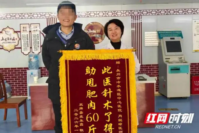 近日,来自双牌县的袁先生将一面写着“此医针术了得,助甩肥肉60斤”字样的锦旗送到永州市中心医院中医科,这不仅是袁先生的由衷赞叹,更是永州市中心医院中医埋线针术疗效的有力见证。