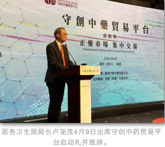 香港特区政府医务卫生局局长卢宠茂4月9日出席守创中药贸易平台启动礼,见证守创中药贸易平台在广州南沙及香港两地同步正式启动,携手推动中医药的传承、创新及发展。