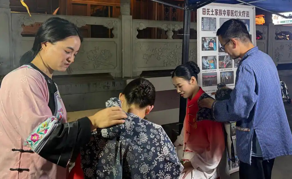 火龙罐划过的皮肤微微发红,雷火灸燃烧后烟雾缓缓飘散,苗族“砖熨疗法”的土布散发出苗药清香的气息……10月17日晚,在贵州省铜仁市中南门古城,中医药文化传播行动·走进中医药传承创新发展试验区(贵州站)活动正在举办,当地市民和外地游客在中医药文化市集的苗族、土家族等特色民族疗法前等候体验。