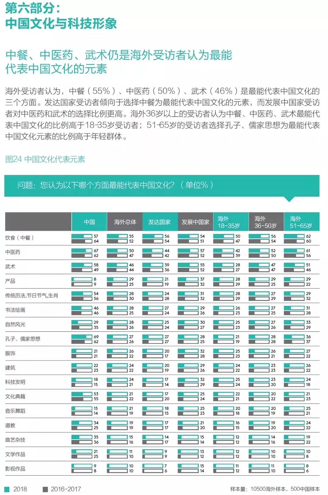 报告显示,50%海外受访者认为“中医药”是中国文化的代表元素,占比位居第二,第一为中餐(55%),第三是武术(46%)。有67%的中国受访者认为中医药是中华文化的代表元素,超过了选择中餐的人数。