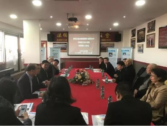 图为代表团一行与省侨联海外顾问、欧洲青田同乡总会会长陈少奇及法国侨商界人士进行座谈