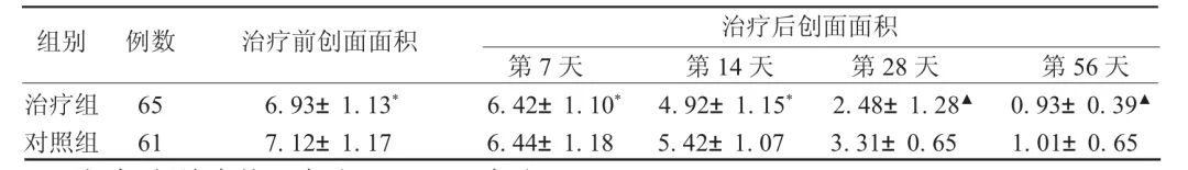 1.5 治疗方法:2组均给予内科常规(降压、降糖、调脂、抗凝等)治疗,在此基础上治疗组予神效生肌散外敷,药物组成:乌贼骨30g,五倍子9g,血竭9g,生大黄18g,白及15g。药物打粉研末,过120目筛后备用;创面均匀覆盖一薄层神效生肌散,2日换药1次。对照组予贝复济(珠海亿胜生物制药有限公司提供,国药准字S19991022)均匀喷洒在创面上,2日换药1次。