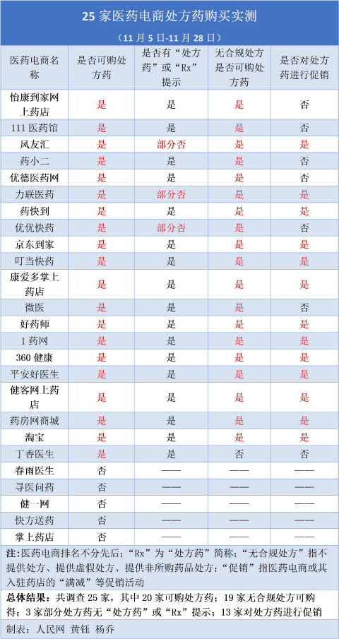 11月5日至28日,人民网就“是否可购处方药”“是否有‘处方药’或‘Rx’提示”“无合规处方是否可购处方药”“是否对处方药进行促销”四项指标,通过线上检索、问诊、下单等方式对25家医药电商进行了实测。