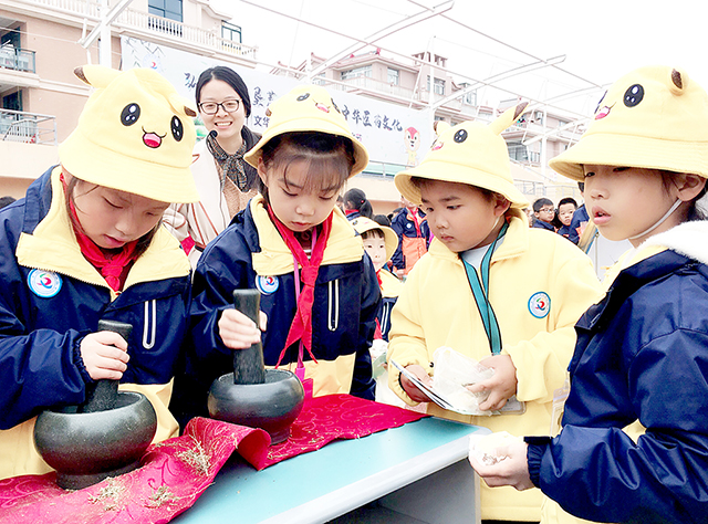 11月25日,浙江省台州市文华小学举行中医药(艾草)文化节,学生在老师和家长的帮助下制作艾绒、艾草香包、艾叶馒头等,并进行干艾草叶、艾草种子等义卖,义卖所得4100元全部捐给台州市椒江区社会福利院。图为孩子们在研磨艾草制作艾绒。 金敏丽/摄