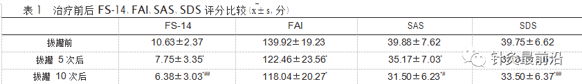 FS-14 评分从拔罐前(10.63±2.37)分下降到拔罐 5 次后的(7.75±3.35)分,再下降到拔罐 10 次后的(6.38±3.03)分,拔罐 5 次后评分与拔罐前评分比较显著下降,拔罐 10 次后评分与拔罐前评分比较显著下降,拔罐 10 次后评分与拔罐 5 次后评分比较显著下降,差异均有统计学意义(P<0.01,P<0.05)。