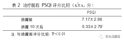 PSQI 评分从拔罐前(7.17±2.86)分下降到拔罐10 次后的(5.33±2.79)分, 拔罐后与拔罐前比较显著下降,差异有统计学意义(P<0.01)。见表 2。
