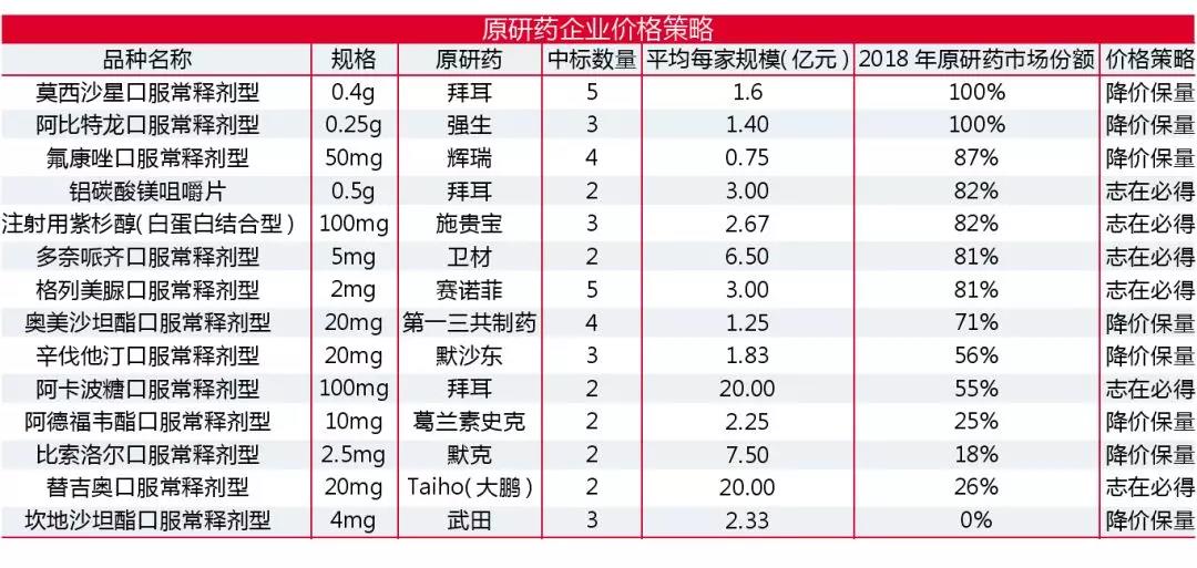 对原研药企业来说,虽然有些过期原研药品种的市场规模和利润较大(静态来看),但相对其创新药市场规模和利润较小(动态来看),因此,过期原研药比创新药的市场机会成本较高一些,换言之,即使品种不中标,还可以依靠创新药获得市场和利润,因此,整体来看,原研药企业不会轻易选择“壮士断腕”的报价策略,如价格“腰斩”。