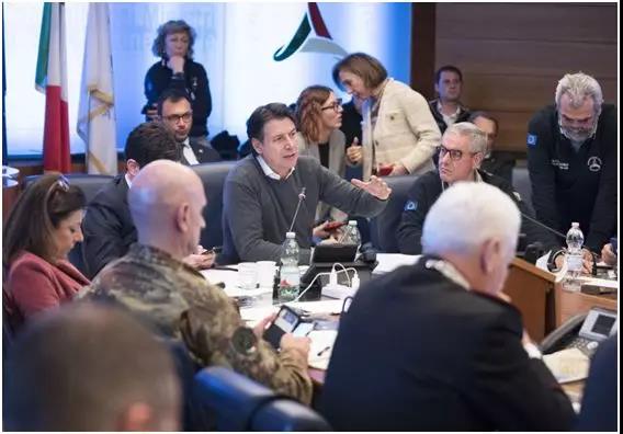 意大利总理孔特23日在民防部主持新冠病毒防疫相关会议。图片来源:意大利总理府