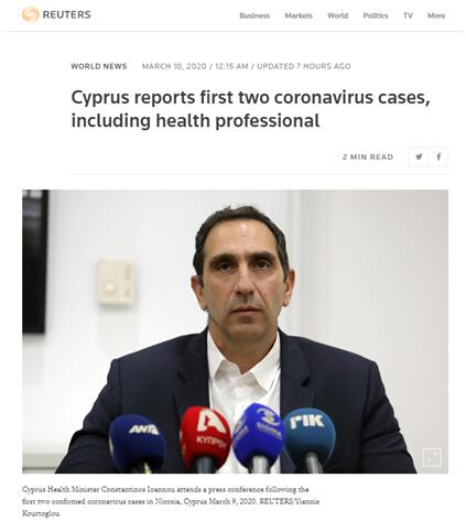 据英国路透社报道,当地时间9日,塞浦路斯卫生部长约安努表示,该国首次出现新冠肺炎确诊病例。其中一例为从意大利北部回国的25岁男子,另一例为3月3日从英国回国的64岁医务人员。