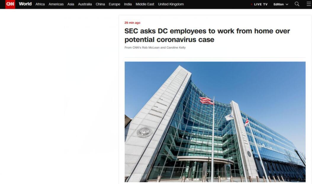 “今天(9日)下午稍晚时候,美国证券交易委员会被告知,华盛顿特区总部的一名员工当天因出现呼吸道(疾病)症状而接受治疗。”CNN援引SEC发言人的话说,医生向这名员工透露,后者可能感染了新冠病毒,并建议他进行相应的病毒检测。