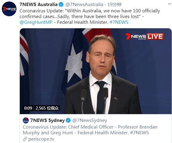 报道称,亨特说,“在澳大利亚国内,我们现在有100例官方确诊的新冠肺炎病例......难过的是,已经有3人丧生”。