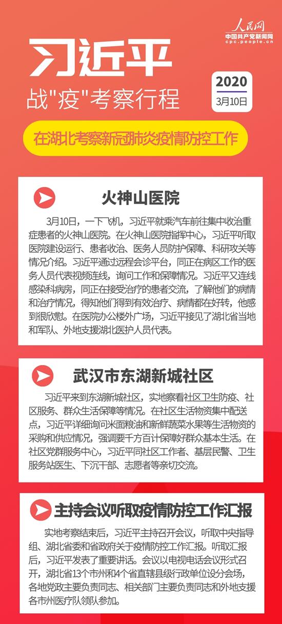 3月10日,中共中央总书记、国家主席、中央军委主席习近平专门赴湖北省武汉市考察新冠肺炎疫情防控工作,看望慰问奋战在一线的广大医务工作者、解放军指战员、社区工作者、公安干警、基层干部、下沉干部、志愿者和患者群众、社区居民。据了解,这是自疫情发生以来习近平总书记第三次亲临战“疫”一线考察调研。2月10日,习近平深入北京市社区、医院、疾控中心,了解基层疫情防控工作情况;3月2日,习近平在北京考察新冠肺炎防控科研攻关工作。