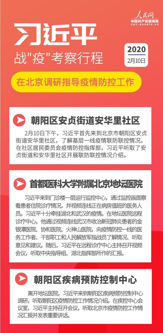 2月10日下午,习近平深入北京市社区、医院、疾控中心,了解基层疫情防控工作情况,并视频连线湖北武汉抗击肺炎疫情前线,给全国奋战在疫情防控一线的医务工作者和广大干部职工送去党中央的关怀和慰问。
