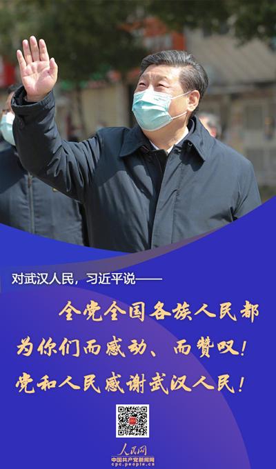 “我在路上就一直在想,武汉市是多么好的一座城市!这是一座英雄的城市,这里的人民是英雄的人民。在这次抗击疫情斗争中,武汉人民展现出了不怕牺牲的精神、勇于担当的精神、顾全大局的精神,还有甘于奉献的精神。这些精神都是中华民族的精神的重要体现,我们一定要好好总结、好好发扬。我相信,通过这次抗击疫情斗争,武汉必将再一次被载入英雄史册!”