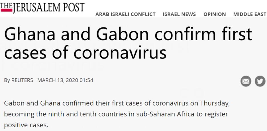 【环球网快讯】以色列《耶路撒冷邮报》刚刚消息,加蓬和加纳当地时间周四(12日)分别证实了该国首例新型冠状病毒确诊病例,成为撒哈拉以南非洲第9个和第10个出现新冠肺炎确诊病例的国家。
