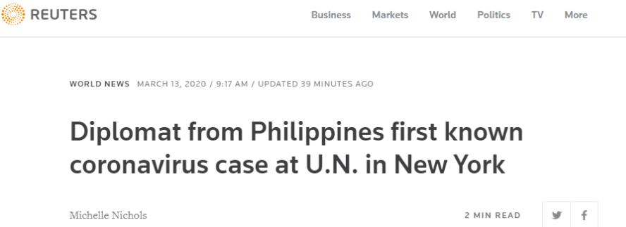 路透社提到,根据联合国外交人员名录,菲律宾使团大约有12名外交官。这位确诊的外交官主要负责法律方面的事务。