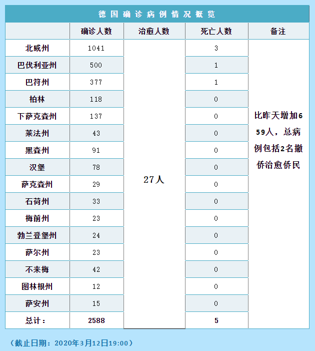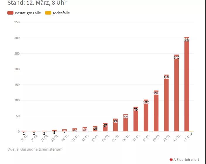 3月12日,德国又有2名新冠肺炎患者死亡,一名男子来自巴符州,今年67岁。另一名来自巴伐利亚州,今年80岁。至此,德国死亡病例共计5例。