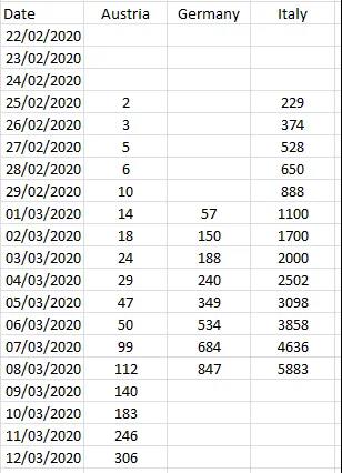 为了对比奥地利同其它国家的情况,维城热心读者Haijun做了一个对比,我们可以把奥地利同德国和意大利放在一起看,很明显,意大利几周前的情况就是我们现在的情况。