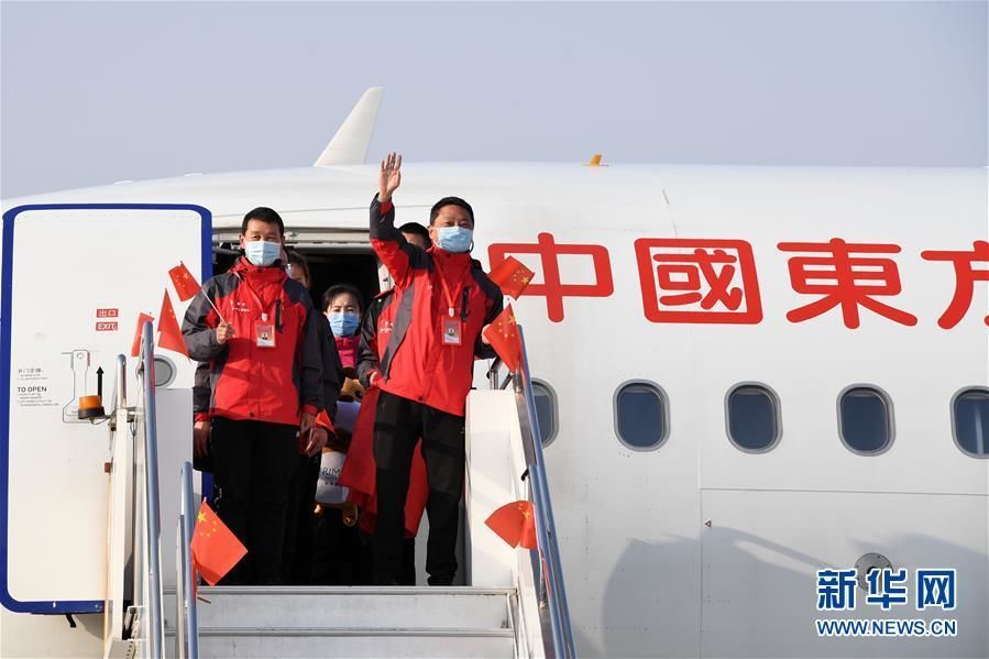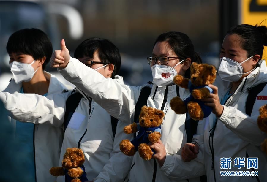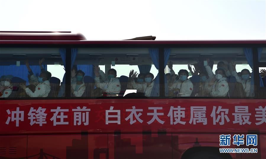 3月17日,在甘肃兰州中川国际机场,医疗队队员向前来接机的人们挥手致意。