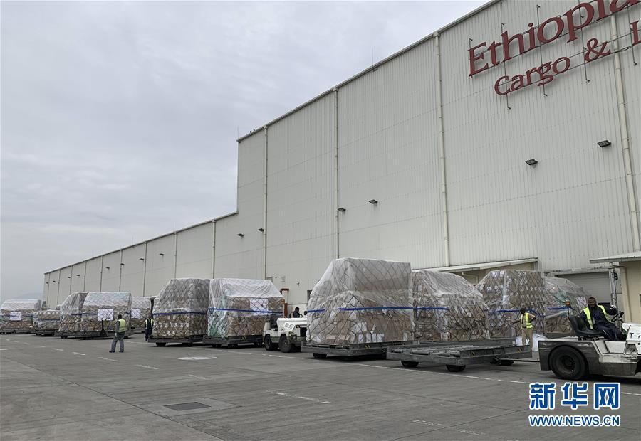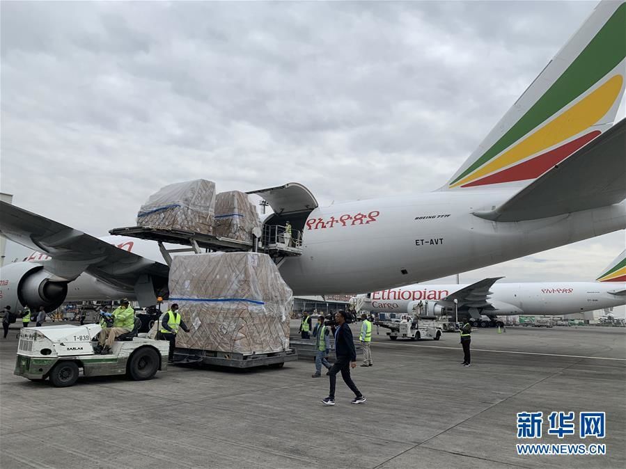 3月22日,在埃塞俄比亚首都亚的斯亚贝巴国际机场,工作人员将中国援助的抗疫物资运下飞机。 历时10小时飞行,满载着来自中国抗疫物资的埃航货运包机22日上午抵达埃塞俄比亚首都亚的斯亚贝巴的国际机场,这是马云公益基金会和阿里巴巴公益基金会捐赠非洲的部分医疗物资,用于支援非洲54国抗击疫情。 新华社记者 王守宝 摄