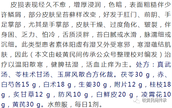 方义分析:此类慢性湿疹,多由脾肾阳虚不能温化寒湿,寒湿蕴于肌肤。湿为阴邪,缠绵难愈,故病程长,反复难愈。高体三教授说“湿归于脾,寒始于肾”。脾肾阳虚不能温化内外寒湿,寒湿瘀滞经络、肌表、营分,卫气内虚,无力透邪外出。高老用真武汤、五苓散、黄芪桂枝五物汤加减温阳化湿。真武汤为治水名方,用于肾阳不足,水湿内停,《医宗金鉴》载真武汤壮里阳以治水。苓桂术甘汤是治饮名方,用于脾阳不足、水湿内停的痰饮证。《医宗金鉴》言苓桂术甘汤“扶阳以敌阴也”。二方合用针对脾肾阳虚,水湿内停病机。方中黄芪为主药,《神农本草经》言黄芪“主大风,癞疾”。白术(本文由岐黄民间传承公众号整理校对编发)益气健脾,两者共用使腠理致密,风邪难入。加入活血药血水同治,赤芍活血利小便,凌霄花既活血又祛风止痒,《本草纲目》言其能去血中伏火,活血通经、凉血祛风。《医学正传》用凌霄花治血中有热,风热痒疹,单味以酒调服,也可与白蒺藜、生地、蝉衣配伍。《证治准绳》载凌霄花散,用凌霄花配黄连、白矾,雄黄,用姜汁调,治风癣湿癣。《本草纲目》言桂枝通达营卫,解肌,《长沙药解》言桂枝渗湿去寒。白鲜皮是皮肤病常用药,《神农本草经》列其为中品,治湿疹疥癣,临床可配伍苍术、苦参、黄连。现代药理研究发现,白鲜皮可以抗真菌,解热抗炎,对细胞免疫、体液免疫均有调节作用。综上,全方温阳散寒,化气行水,补气固表,针对寒湿病机以治其本,活血祛风止痒以治其标。标本兼治,顽疾可除。外用药同血虚风燥。