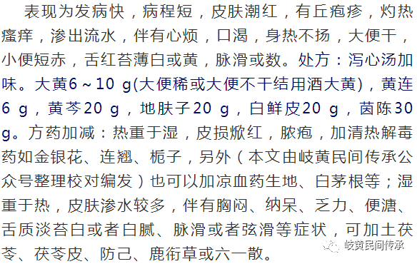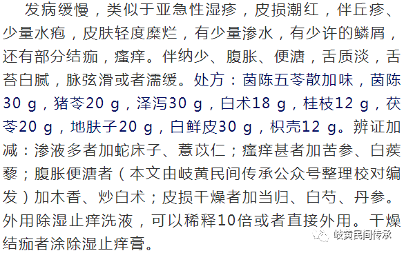 方义分析:茵陈五苓散是《金匮要略》治疗黄疸湿重于热的方子,其与此类型湿疹病机相似。《神农本草经》载茵陈主治“风湿寒热邪气,热结黄疸”。《本草思辨录》载茵陈“善解肌表之湿热”。《千金方》用茵陈治通身瘙痒,外洗治疗疥疮。五苓散温阳化气利水,加地肤子、白鲜皮(本文由岐黄民间传承公众号整理校对编发)治湿祛风止痒药治标。《神农本草经》载枳壳“主大风在皮肤中,如麻豆苦痒,除寒热结,止利,长肌肉,利五脏,益气轻身。”止痒有良效。