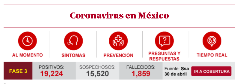 墨西哥当地时间4月30日,墨西哥卫生部宣布,截至当地时间4月30日晚上7点,墨西哥全国累计确诊19224例新冠肺炎病例,较前一天新增了1425例。同时,墨西哥全国确诊死亡病例较前一天新增127例,总数已经上升到1859例。(总台记者 盛嘉迪 吕兴林)