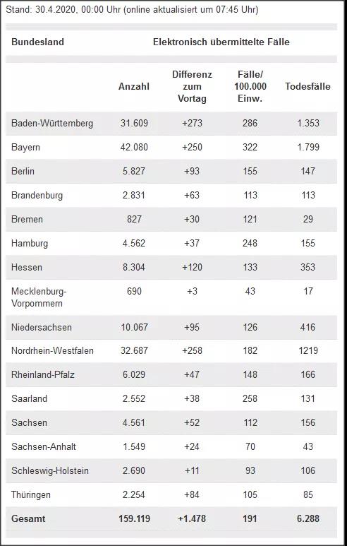 根据上面的数据显示,截至4月30日零时,德国感染病患数为159119人,当天新增病例1478例,治愈人数大约为123500人,占总感染比例从29日的76%上升到77.6%,仍在治疗中的人数为29331人,每十万人中会有191人感染,死亡人数为6288人,死亡率仍约为3.9%。