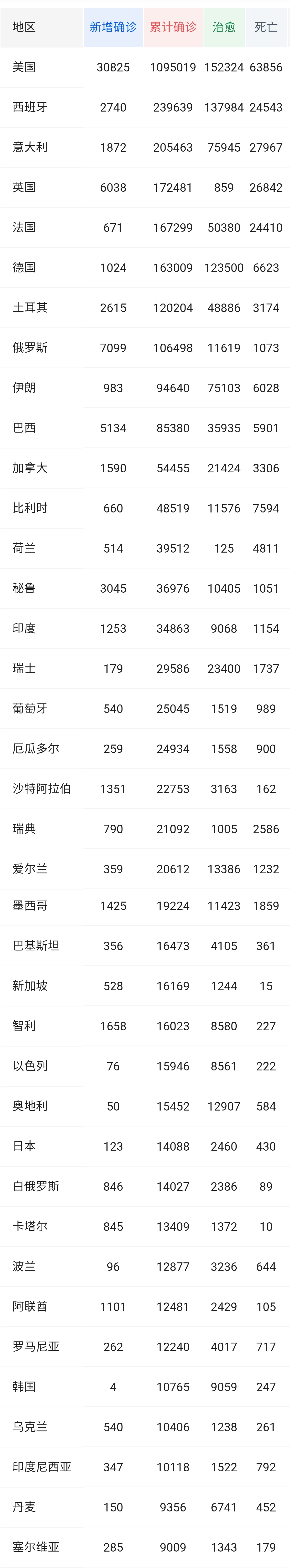 据巴基斯坦卫生部30日公布的最新数据,该国累计新冠确诊病例16473例,累计死亡病例361例,累计治愈病例4105例。