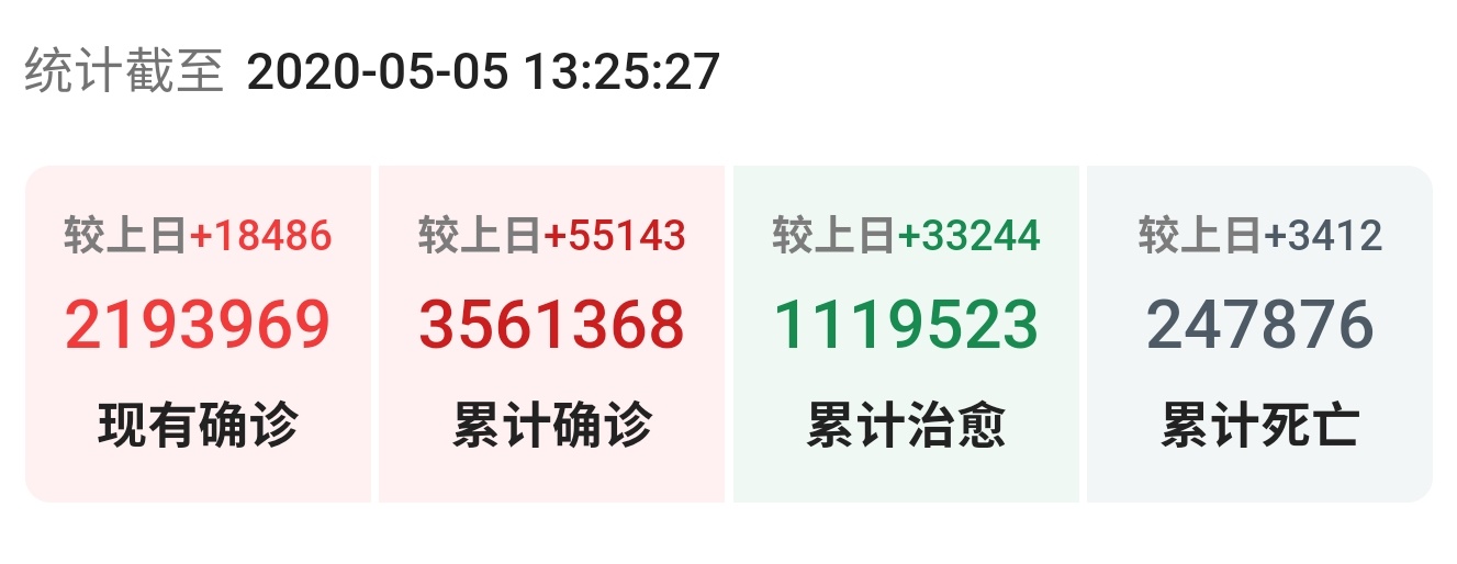 【海外网5月5日|战疫全时区】 据美国约翰斯·霍普金斯大学数据实时数据显示,截至北京时间5月5日6时30分左右,全球累计确诊新冠肺炎病例3573864例,累计死亡250687例。其中美国累计确诊1177784例,死亡68442例。与前一日6时30分数据相比,美国新增确诊病例23163例,新增死亡病例991例。