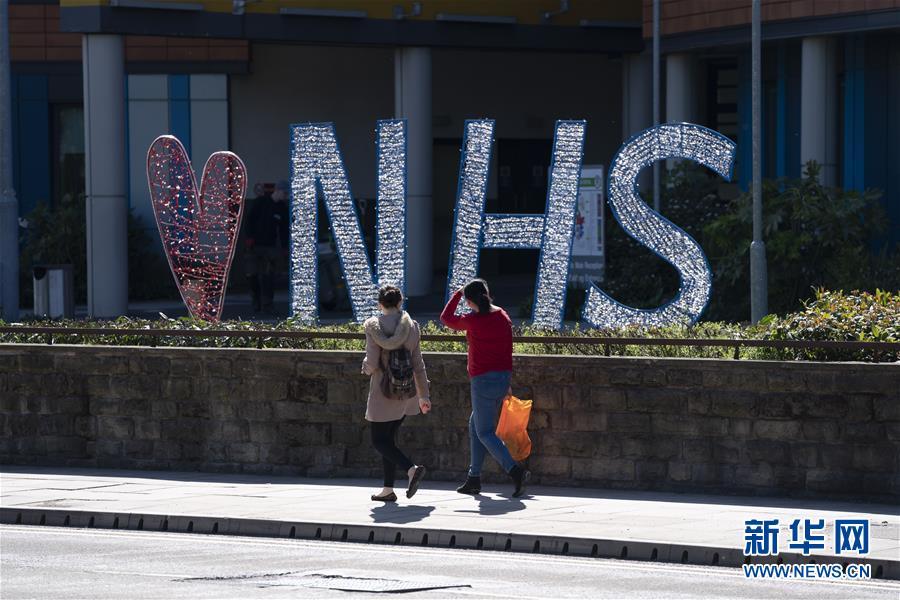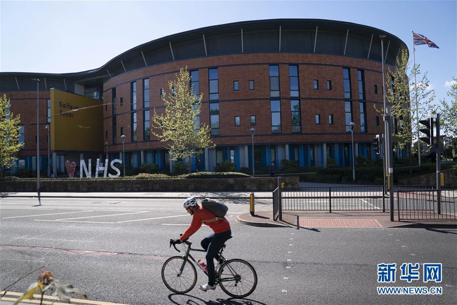 5月5日,在英国曼彻斯特,一个表示支持英国国民保健制度(NHS)的标志摆放在萨尔福德皇家医院外。