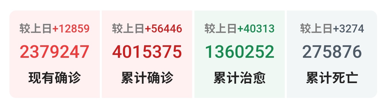数据显示,现有患者人数比前一天减少3119人,降至84842人。在现有患者中,69974人在居家隔离,13834人在医院接受普通治疗,1034人在重症监护室接受治疗。普通住院病例和重症病例分别比前一天减少802例和134例。