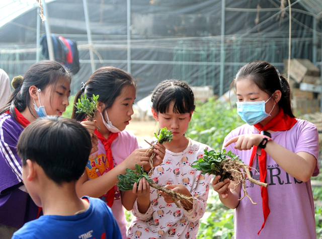 5月6日,依托青海省中藏医药文化进校园活动,青海省中医院的药学专家在西宁市城西区黄河路小学试验田带领该校及西宁市阳光小学学生种植、辨识中药。图为学生们学习辨识板蓝根。