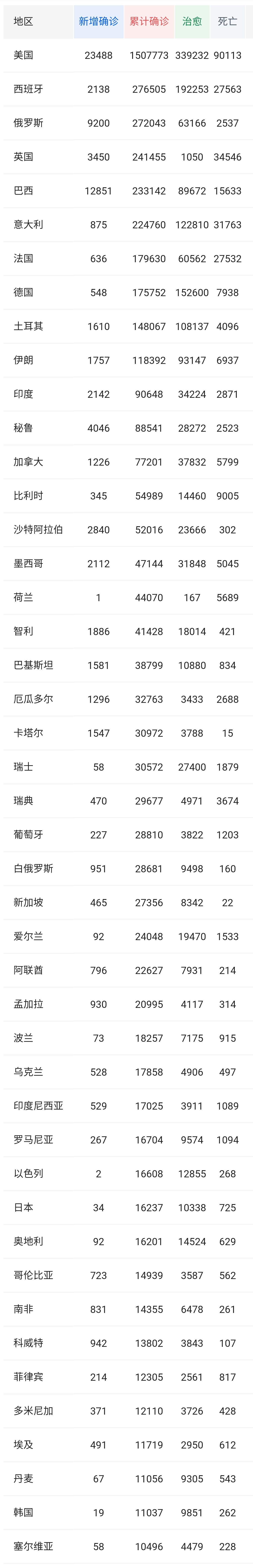 【环球时报-环球网驻巴基斯坦特派记者 丁雪真】巴基斯坦国家健康服务、管理和协调部16日发布的疫情数据显示,该国15日新增确诊病例1581例,新增死亡病例31例,新增治愈出院病例725例。截至15日,巴基斯坦累计确诊病例38799例,累计死亡病例834例,累计治愈出院病例10880例,累计进行核酸检测359264人次。