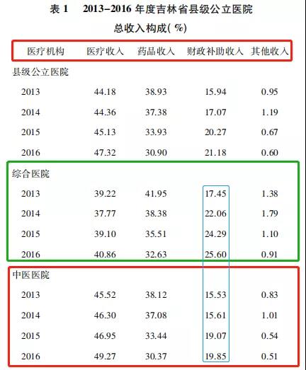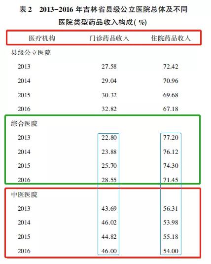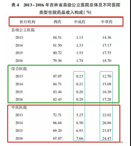 吉林大学公共卫生学院的几位作者,在2019年详细研究了吉林全省80家县级医院,其中综合医院42家,中医院38家,研究重点是医院收入结构、中药和西药占比。研究显示: