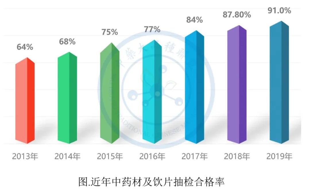 据中药大品种联盟发布的报告分析,在监管方的大力关注和业界积极努力下,近年来中药饮片质量取得了长足的进步,抽检合格率逐步攀升(从2013年的64%,提升到2019年91%),以往掺杂使假、增重染色等恶意违规得到了有效遏制。