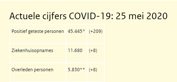 荷兰国家公共卫生与环境研究院(RIVM)5月25日14:00消息 过去24小时内,RIVM接到209例新增确诊病例报告,高于昨天的172例和前天的176例,累计确诊45445例;新增死亡8例,低于昨天的11例和前天的23例,累计死亡5830例,死亡率由之前多日的12.9%降至12.8%。