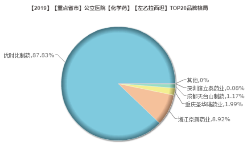 米内网数据显示,2018年在中国城市公立医院、县级公立医院、城市社区中心及乡镇卫生院(简称中国公立医疗机构)终端左乙拉西坦销售额为10.39亿元,其中片剂占比近90%。随着近年国内仿制药的发力,原研药企优时比制药的市场份额已从最初的独占市场,下滑到2019年的87.83%,紧随其后的是京新药业(8.92%)、重庆圣华曦(1.99%)、天台山制药(1.17%)、深圳信立泰(0.08%)。