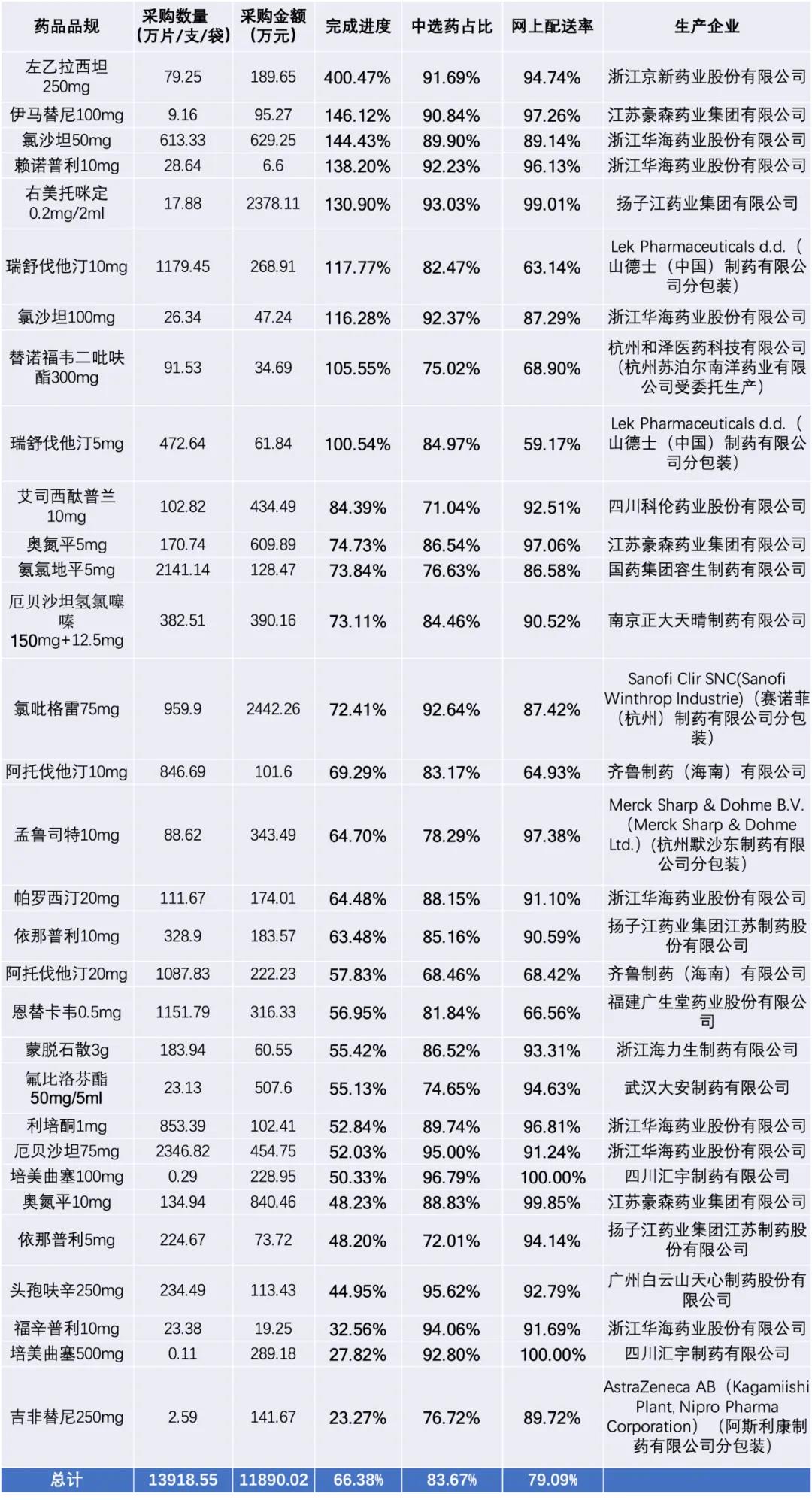 31个品规的完成进度平均达85.36%,其中瑞舒伐他汀10mg、瑞舒伐他汀5mg、赖诺普利10mg、替诺福韦二吡呋酯300mg、氯沙坦100mg、氯沙坦50mg、左乙拉西坦250mg、伊马替尼100mg和右美托咪定0.2mg/2ml等9个品规已完成全省约定采购数量。