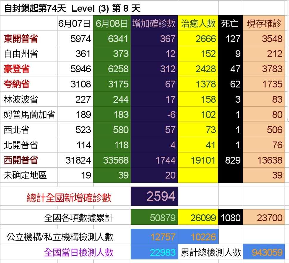 6月8日,南非新冠肺炎确诊人数新增2594例,累计总确诊50879例。新增死亡82例,累计死亡1080例。各省累计确诊病例:东开普省6341例,自由州省373例,豪登省6258例,夸祖鲁纳塔尔省3175例,林波波省244例,姆普马兰加省183例,西北省580例,北开普省118例,西开普省33568例,未知地区39例。各省累计死亡病例:东开普省127例,自由州省9例,豪登省47例,夸祖鲁纳塔尔省62例,林波波省3例,姆普马兰加省1例,西北省1例,北开普省1例,西开普省829例。