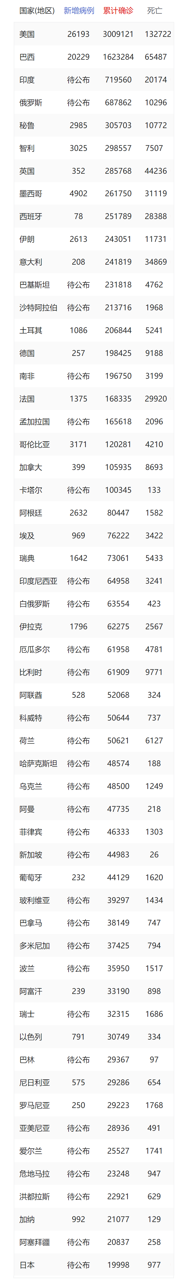 截至5日,巴基斯坦累计确诊病例231818例,累计死亡病例4762例,累计治愈出院病例131649例,累计完成核酸检测1420623人次。
