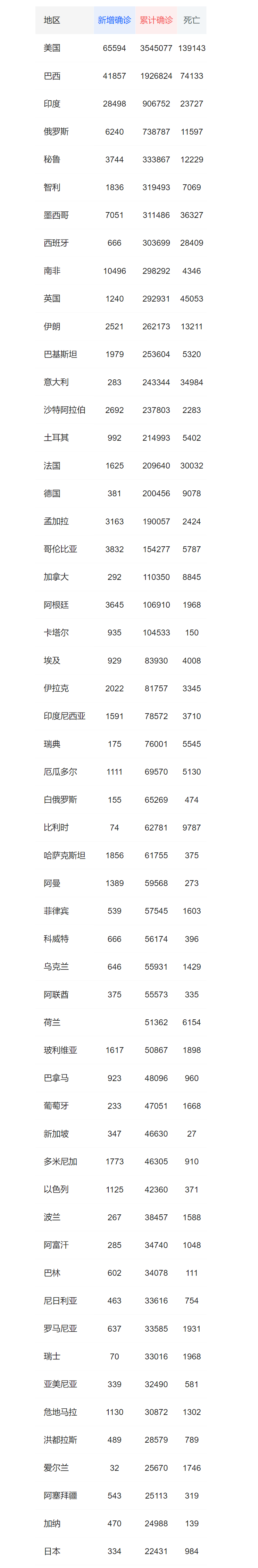 (本表数据来自腾讯网由多方来源总结。由于各国数据来源多样也存在时差等因素,若有数据错误,敬请谅解)