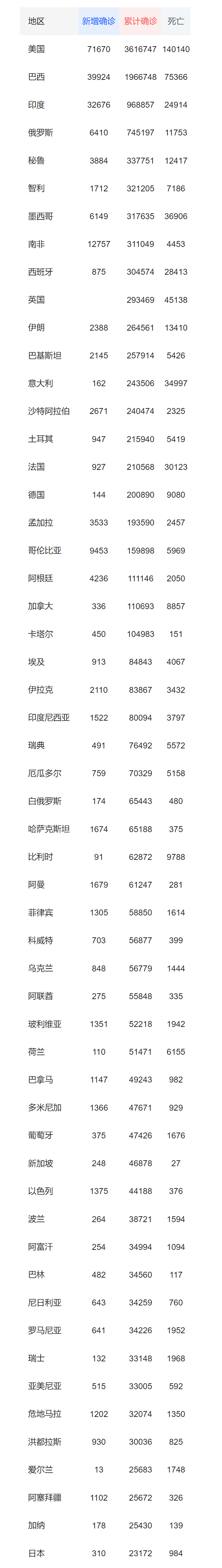 (本表数据来自腾讯网由多方来源总结。由于各国数据来源多样也存在时差等因素,若有数据错误,敬请谅解)