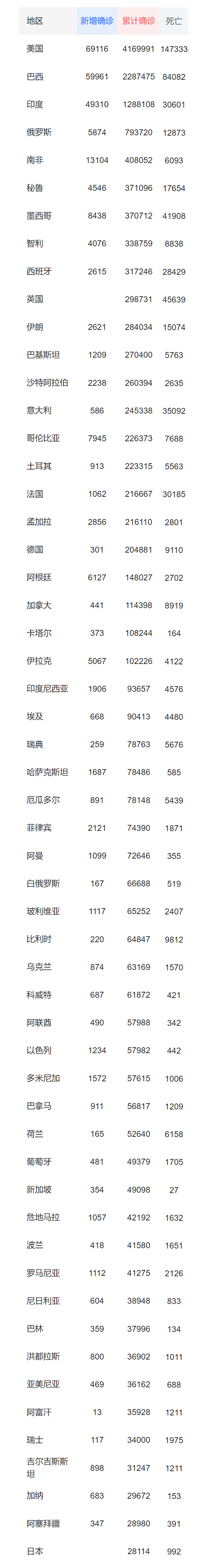 (本表数据来自腾讯网由多方来源总结。由于各国数据来源多样也存在时差等因素,若有数据错误,敬请谅解)