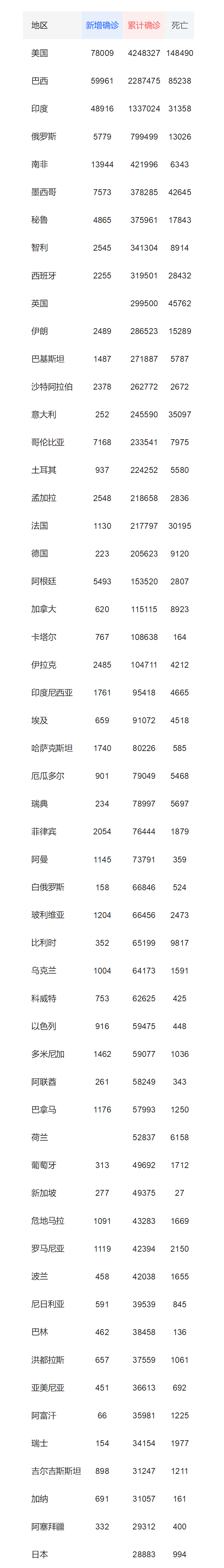 (本表数据来自腾讯网由多方来源总结。由于各国数据来源多样也存在时差等因素,若有数据错误,敬请谅解)