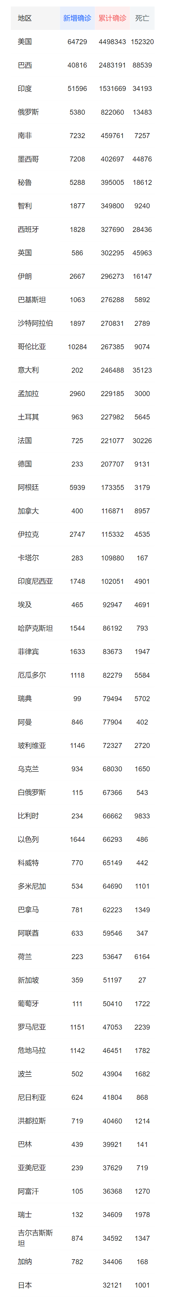 (本表数据来自腾讯网由多方来源总结。由于各国数据来源多样也存在时差等因素,若有数据错误,敬请谅解)