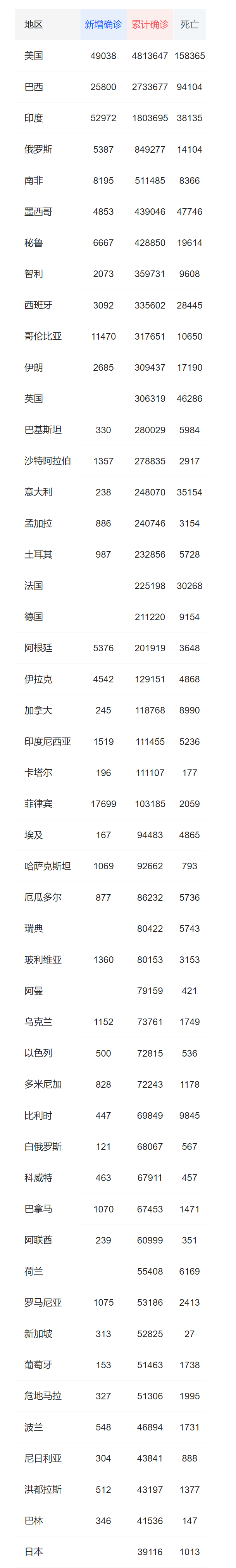 美国、巴西、印度、哥伦比亚和南非仍是全球单日新增确诊病例最多的前五个国家,拉美多国新增病例较多。